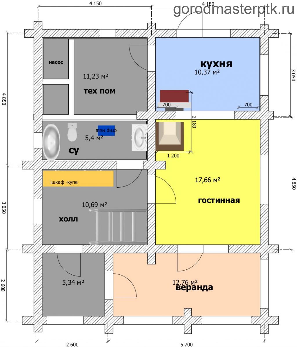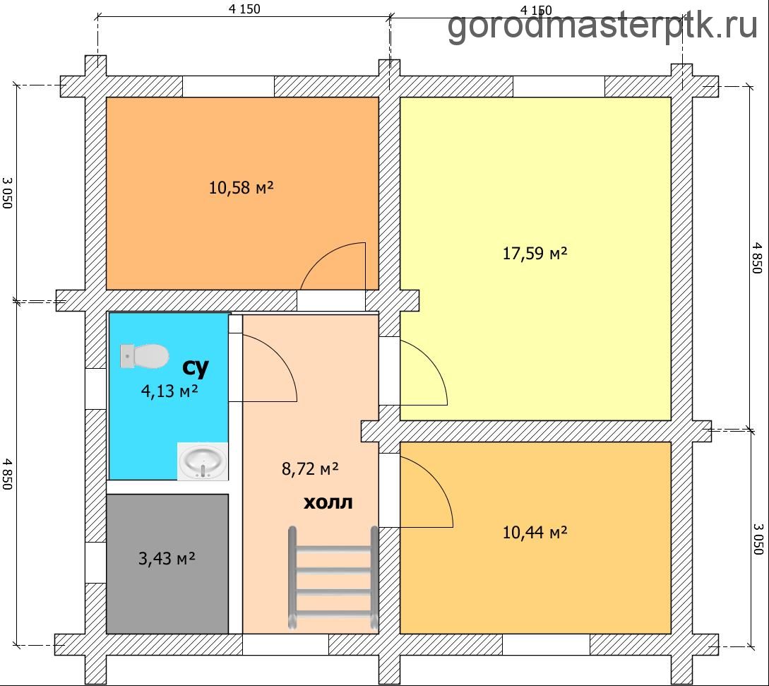 Размер по осям: 8,3х10,5м. Наружный размер: 9х11 м.